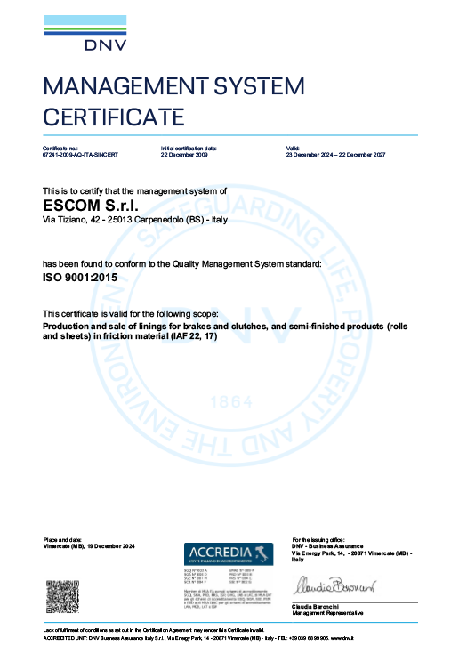 ESCOM Srl es una empresa italiana que desde 1993 se ha especializado en la producción de forros de freno para sistemas de frenado en los siguientes sectores: automóvil, motocicletas, agricultura y mecánica industrial. La producción se lleva a cabo mediante el procesamiento y la transformación de los materiales de fricción sin amianto de la marca Beral, que son producidos en Alemania por la empresa filial EUROBREMSBAND GmbH.